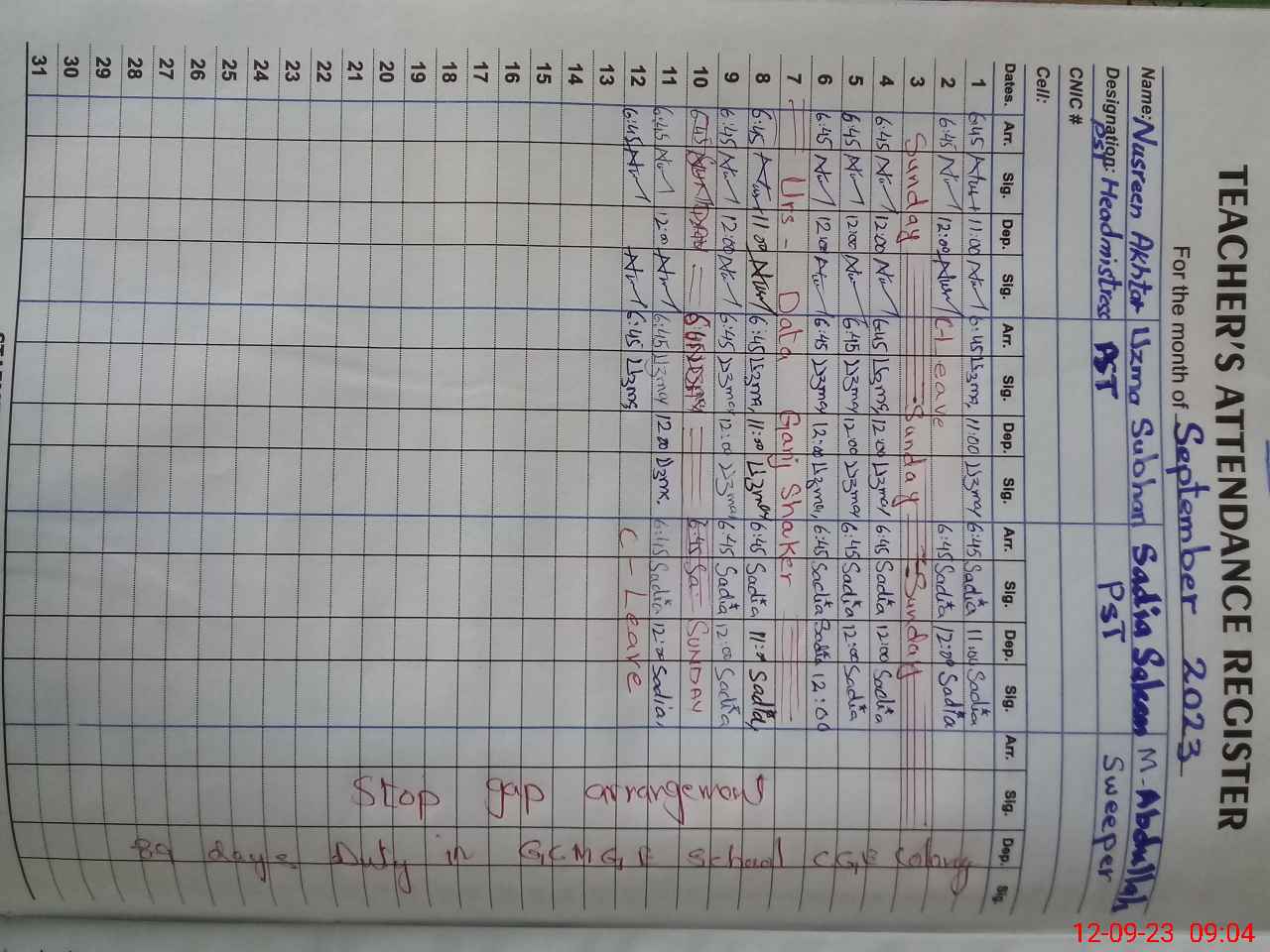 | CNIC | Full Name | Designation | R/C | Absence During Last Calender Month |
