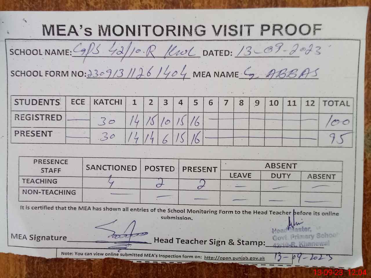 | EMIS Code: 36420156 | Name of School: GPS 42/10-R, KHANEWAL | |||