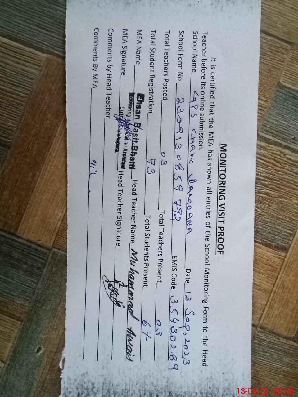 | Attendance Register | Head Teacher | MEA with School | Visit Proof |