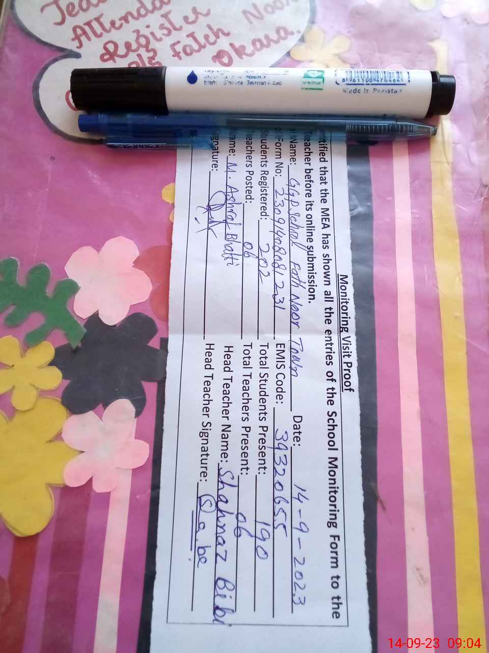 | Attendance Register | Head Teacher | MEA with School | Visit Proof |