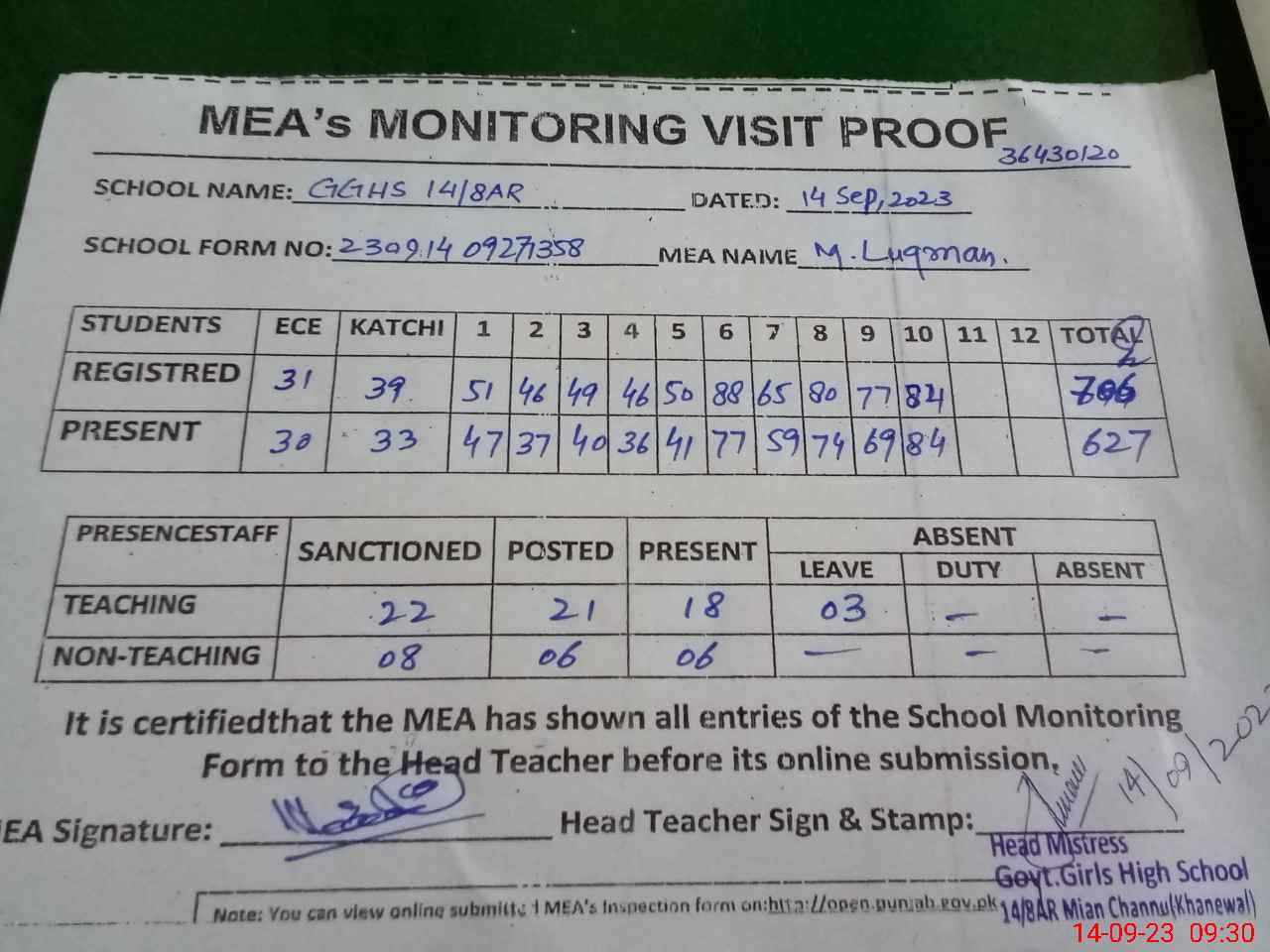 | Attendance Register | Head Teacher | MEA with School | Visit Proof |