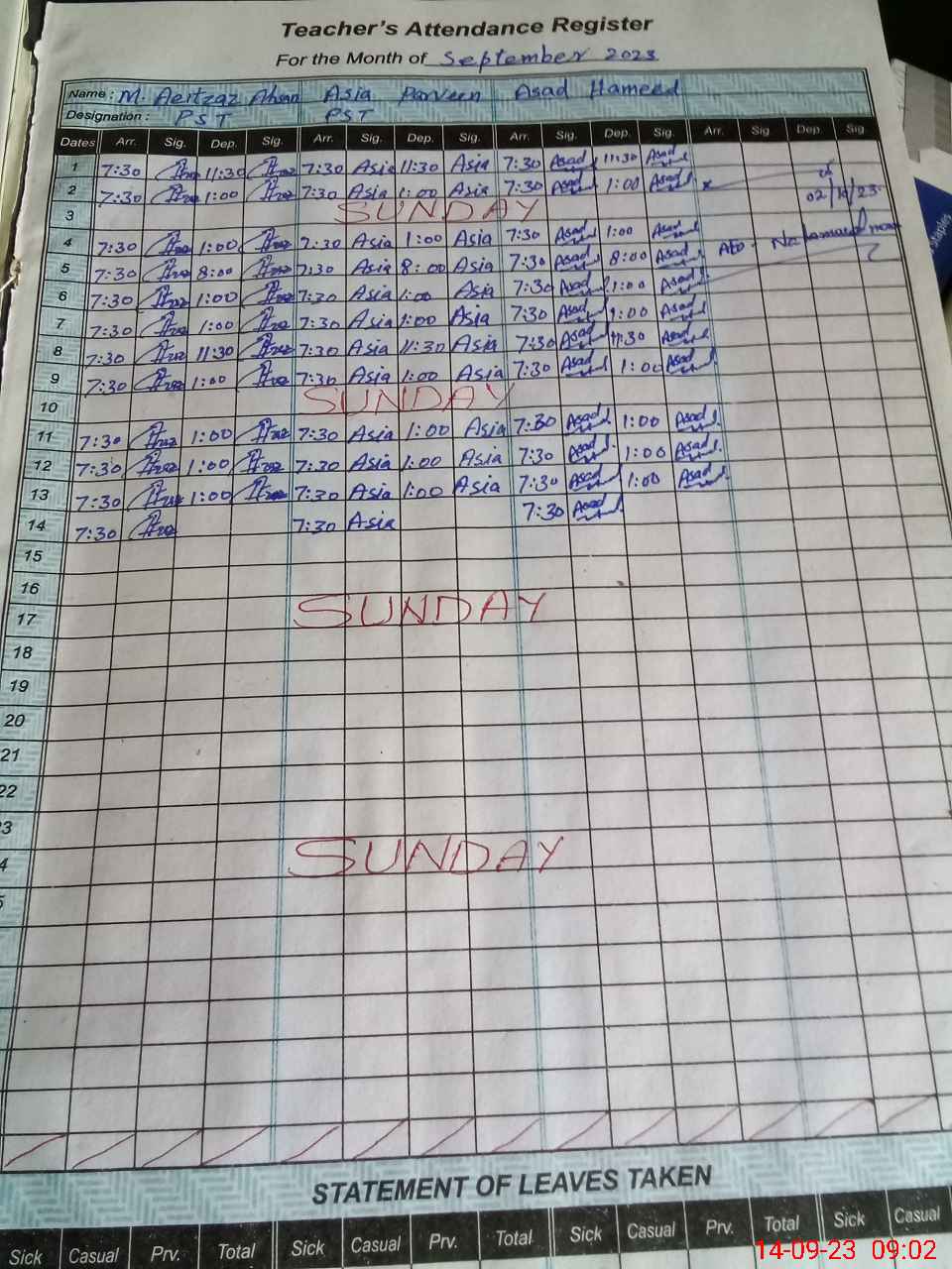 | Monitoring Date: 14-09-2023 | Start Time: 14-09-2023 08:48 AM | End Time: 14-09-2023 09:11 AM | Name of MEA: Za**** Me**** | |
