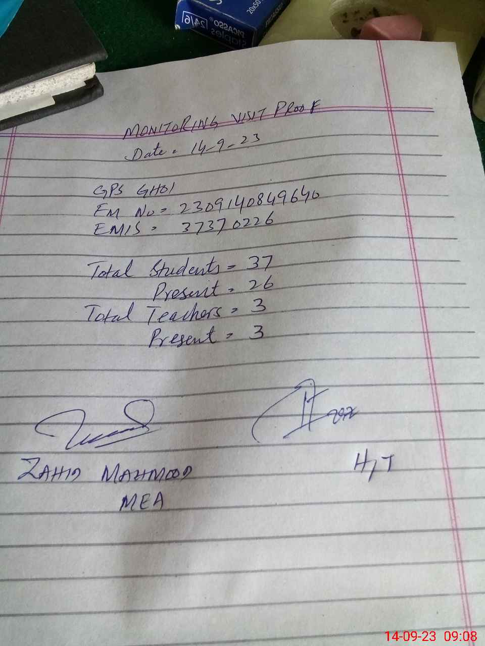 | Attendance Register | Head Teacher | MEA with School | Visit Proof |