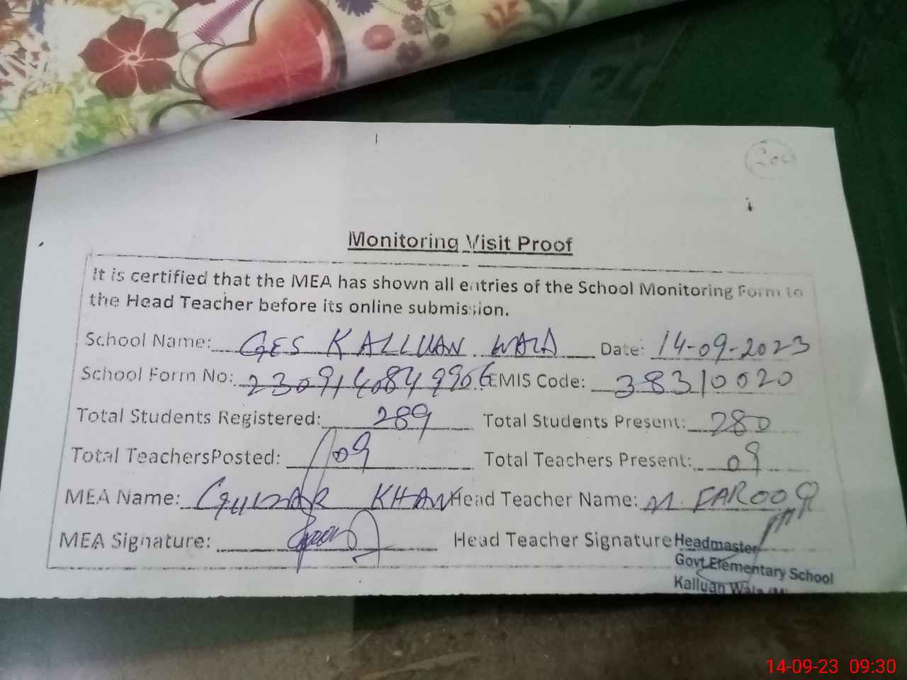 | Attendance Register | Head Teacher | MEA with School | Visit Proof |