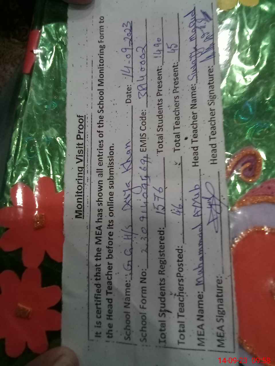| Attendance Register | Head Teacher | MEA with School | Visit Proof |