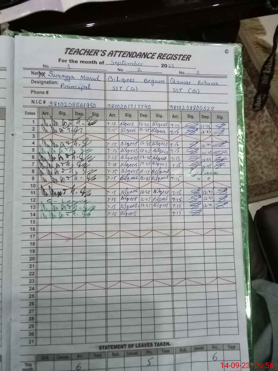 | CNIC | Full Name | Designation | R/C | Absence During Last Calender Month |