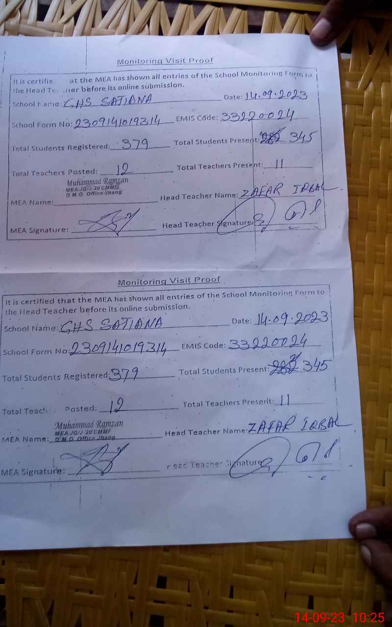 | EMIS Code: 33220024 | Name of School: GHS SATIANA JHANG | |||
