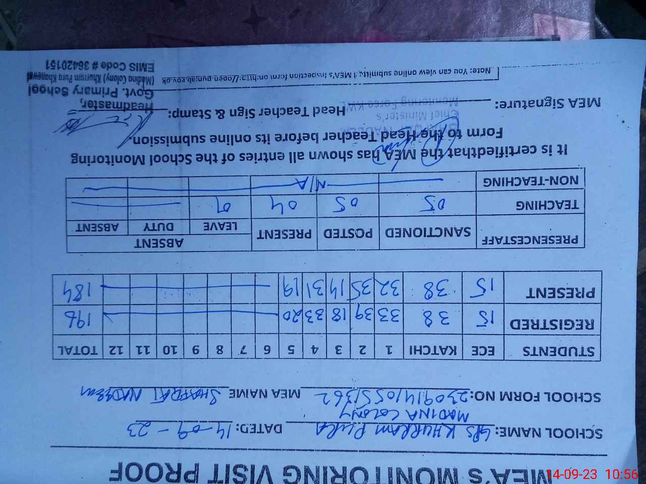 | Attendance Register | Head Teacher | MEA with School | Visit Proof |