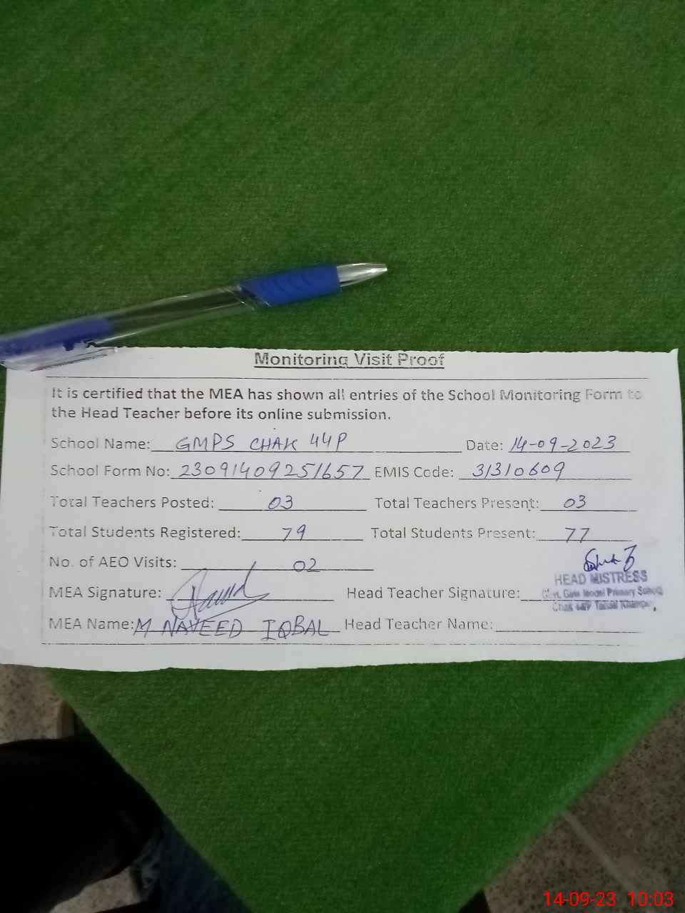 | EMIS Code: 31310609 | Name of School: GMPS CHAK 44/P (After Noon) | |||