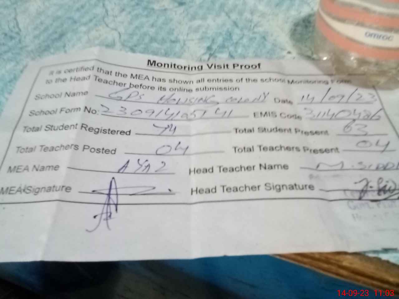 | Attendance Register | Head Teacher | MEA with School | Visit Proof |