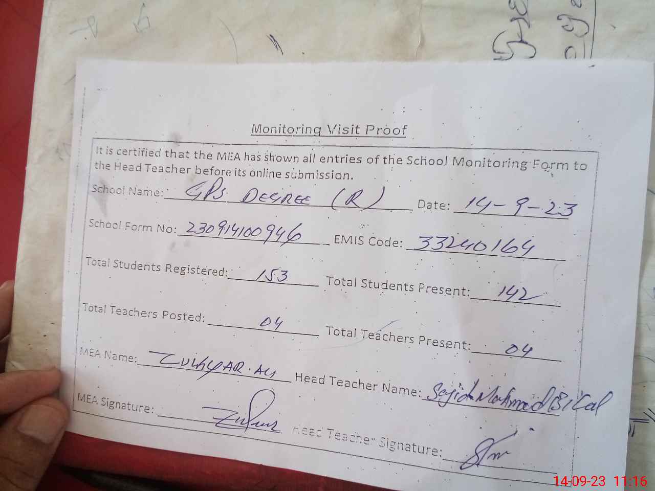 | Attendance Register | Head Teacher | MEA with School | Visit Proof |