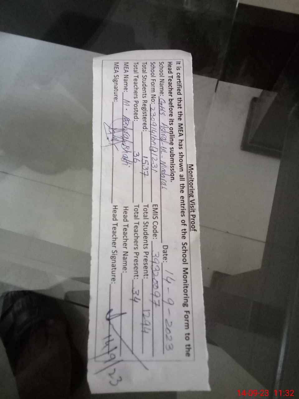 | Attendance Register | Head Teacher | MEA with School | Visit Proof |