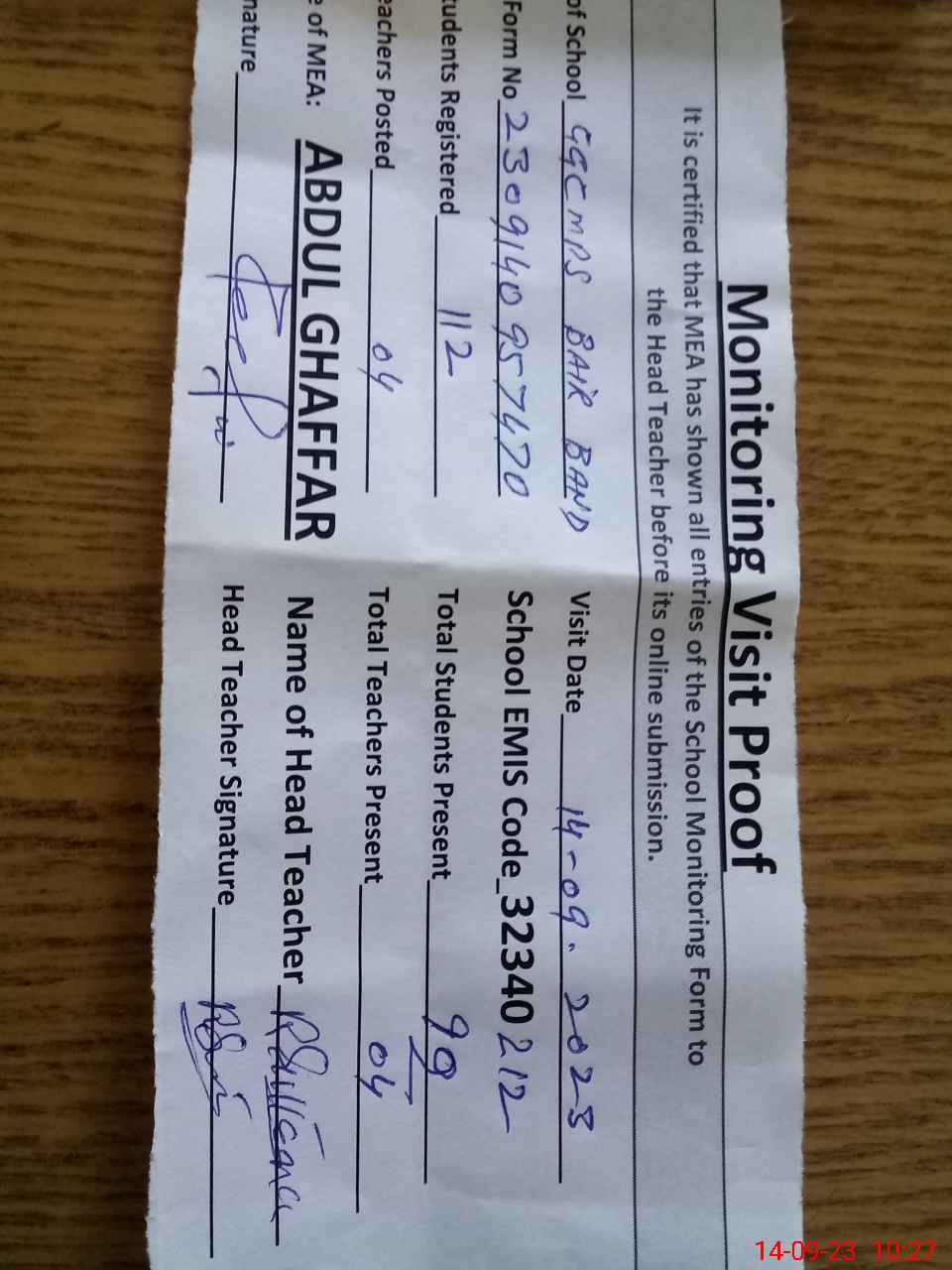 | Attendance Register | Head Teacher | MEA with School | Visit Proof |