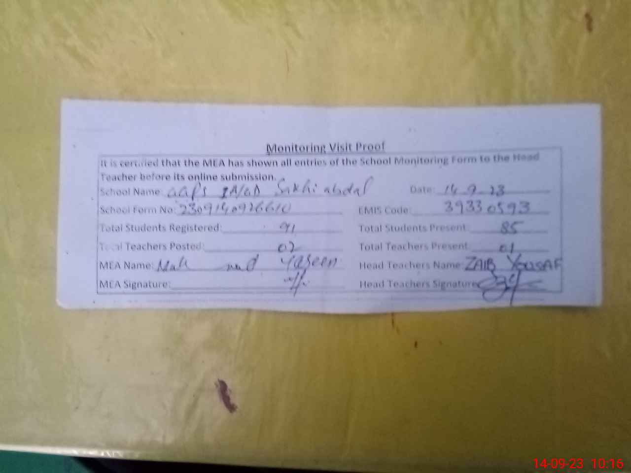 | Attendance Register | Head Teacher | MEA with School | Visit Proof |