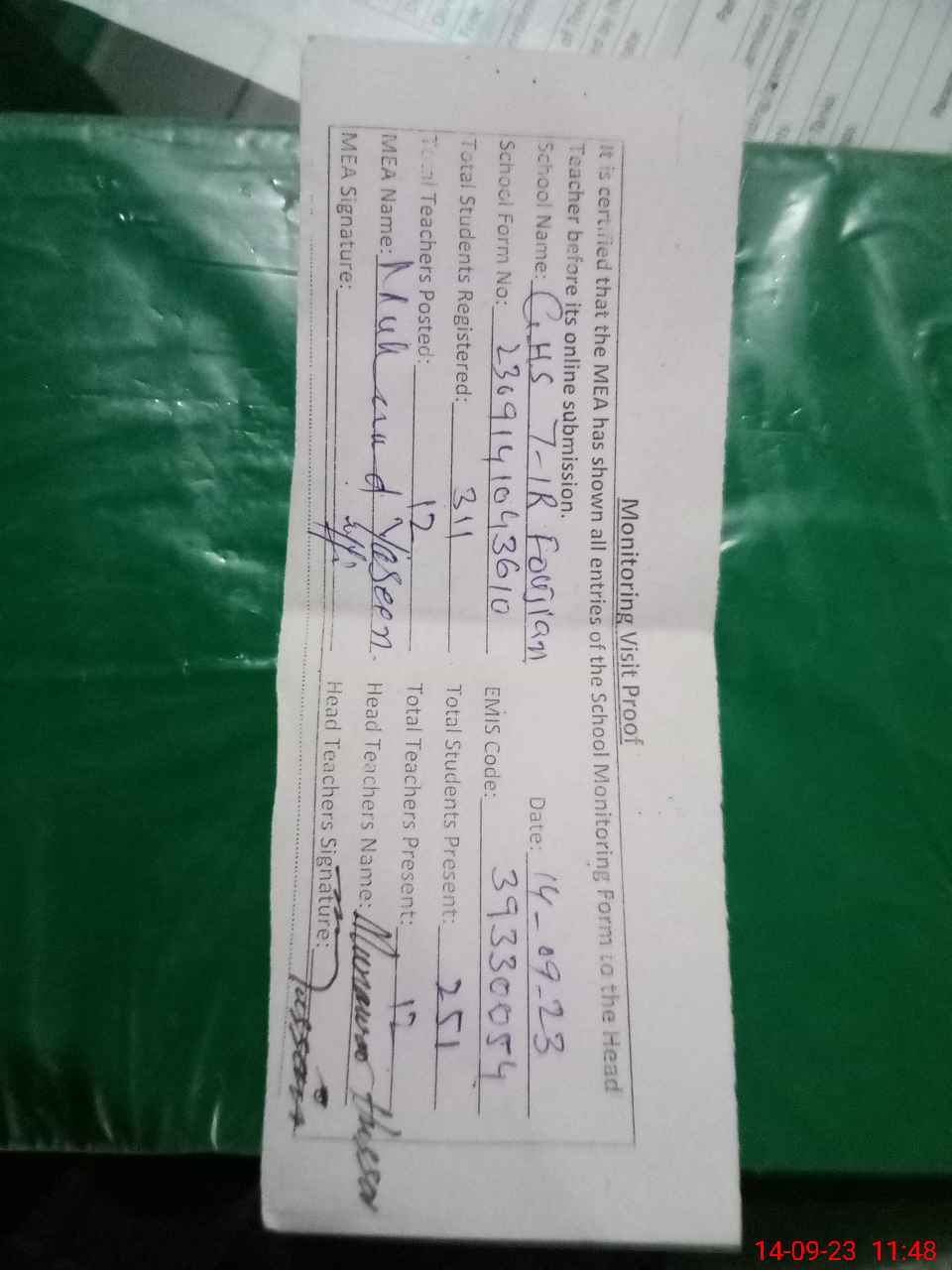 | Attendance Register | Head Teacher | MEA with School | Visit Proof |