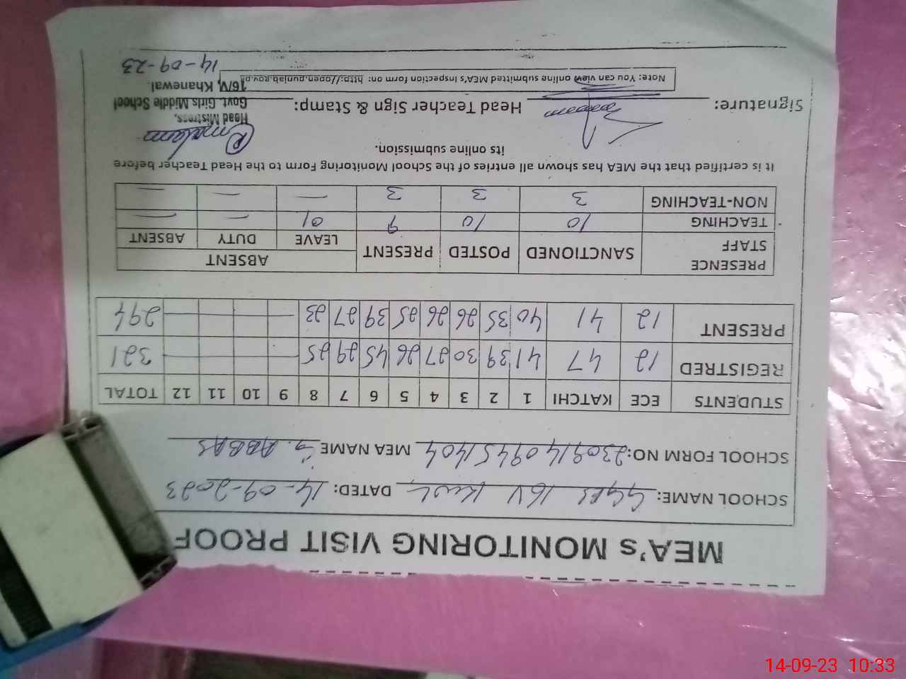 | Attendance Register | Head Teacher | MEA with School | Visit Proof |