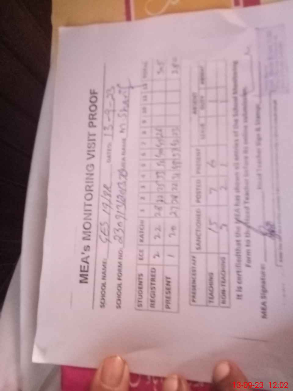 | Attendance Register | Head Teacher | MEA with School | Visit Proof |