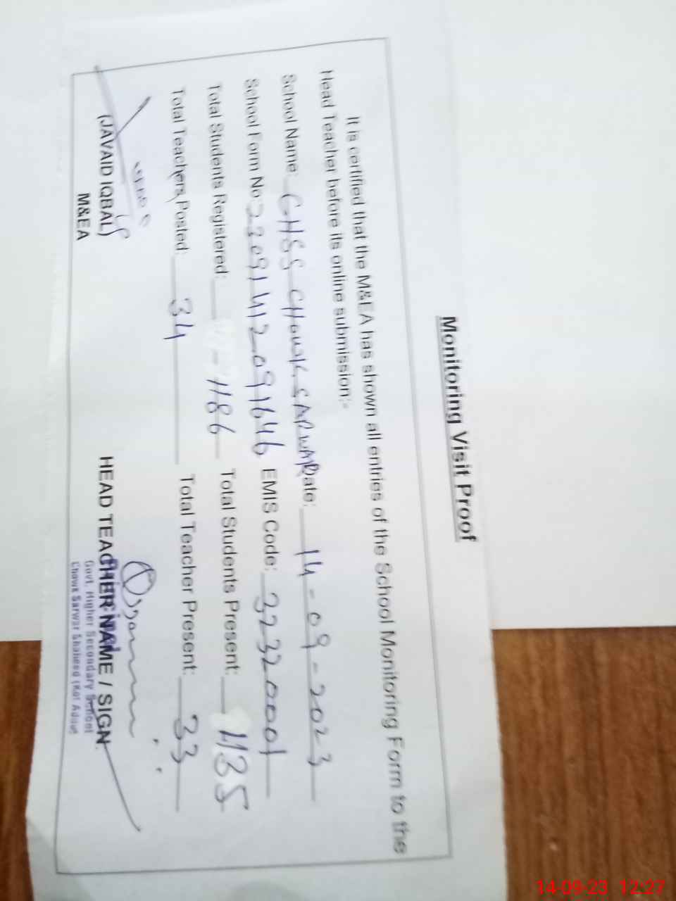 | Attendance Register | Head Teacher | MEA with School | Visit Proof |