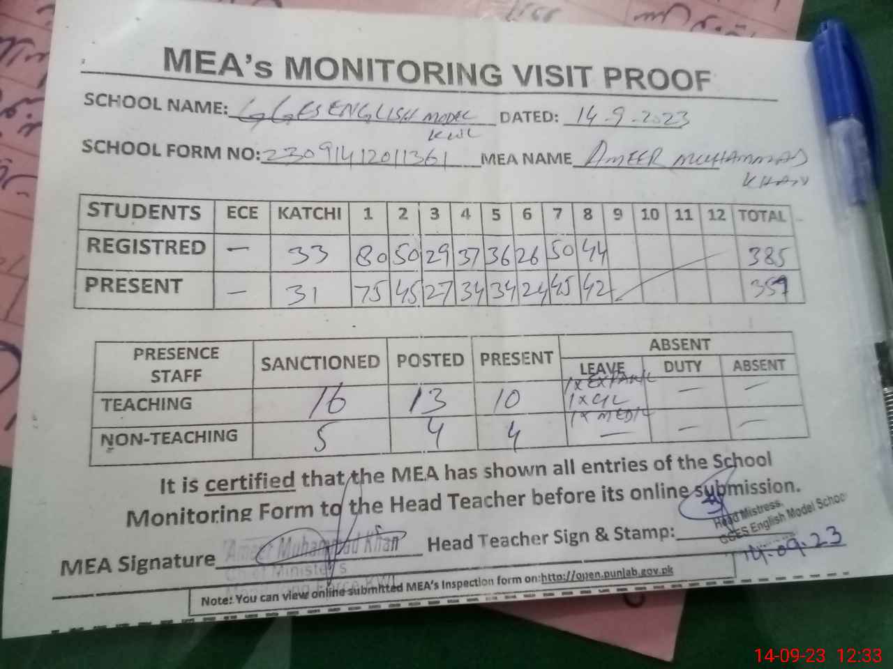 | Attendance Register | Head Teacher | MEA with School | Visit Proof |