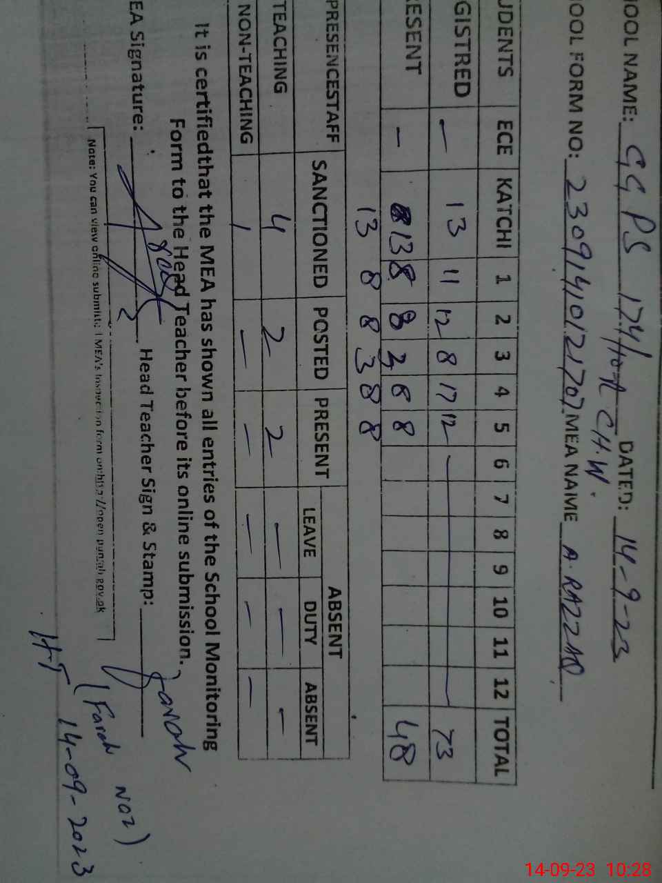 | Attendance Register | Head Teacher | MEA with School | Visit Proof |