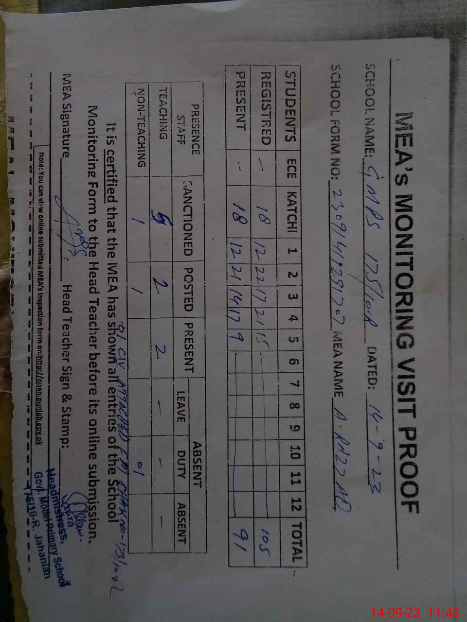 | Attendance Register | Head Teacher | MEA with School | Visit Proof |
