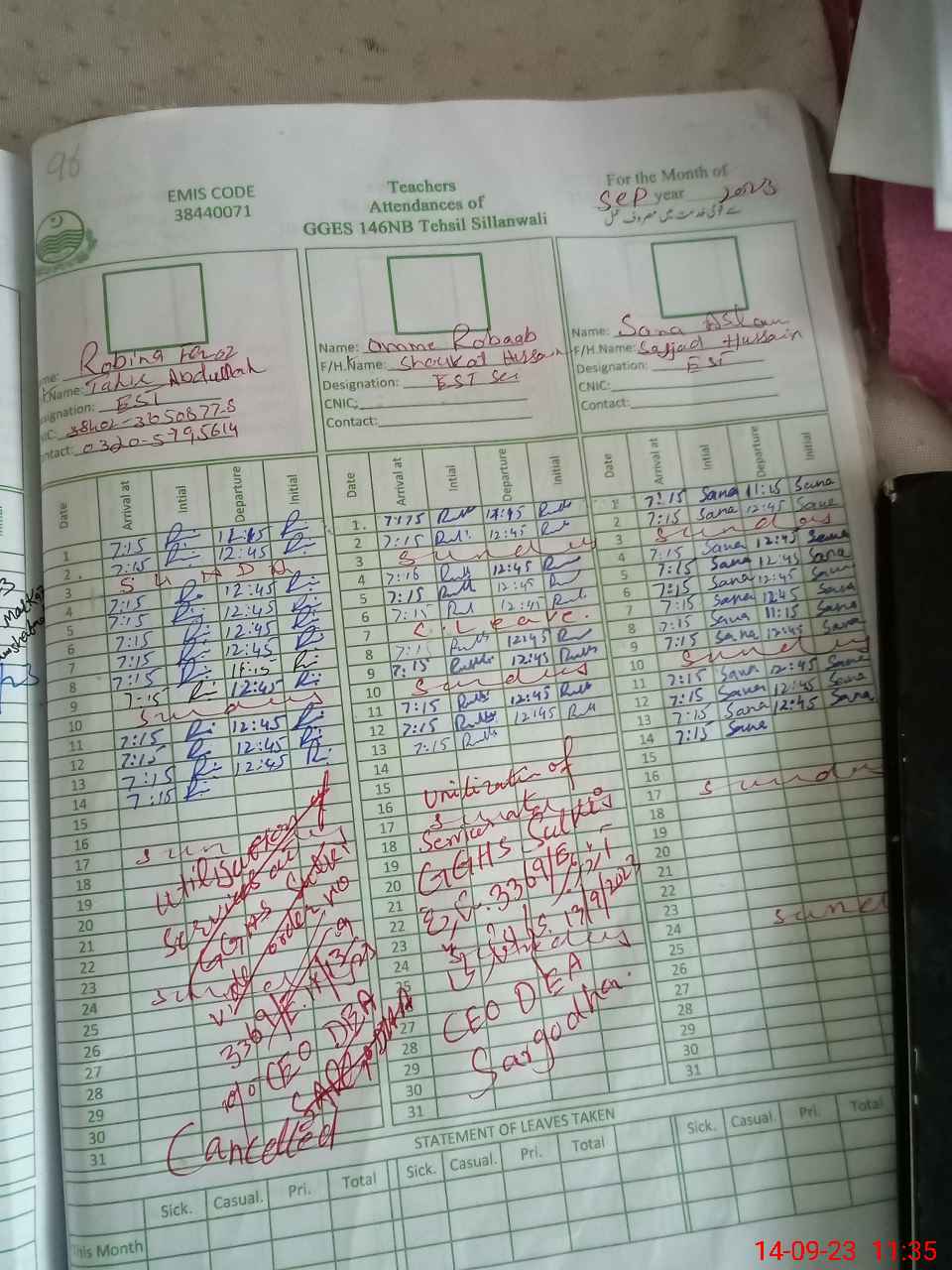 | Remarks (Use Separate Page if Required): EST omme rubbab on temporary duty from this school Start from today dated 14 09 2023 to GGHS sulki emis code 38450459 teh sahiwal | |||||
