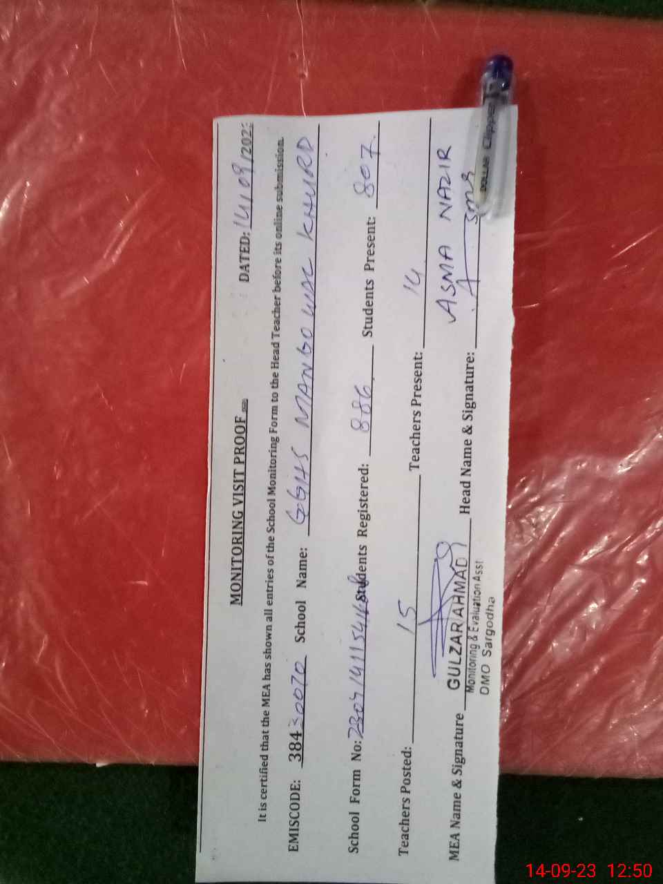 | Attendance Register | Head Teacher | MEA with School | Visit Proof |