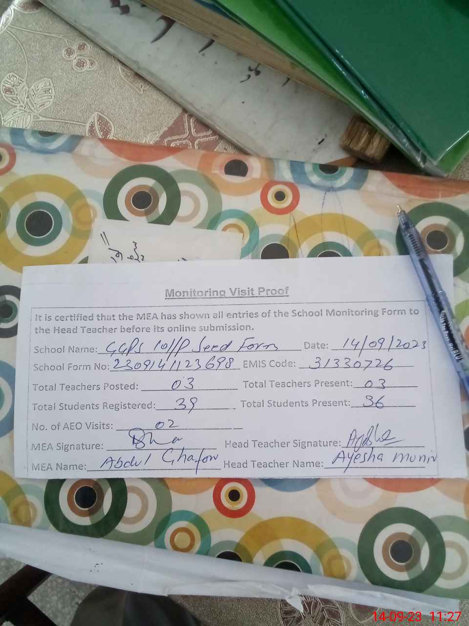 | Attendance Register | Head Teacher | MEA with School | Visit Proof |