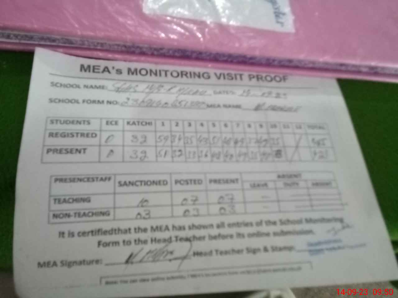 | Attendance Register | Head Teacher | MEA with School | Visit Proof |