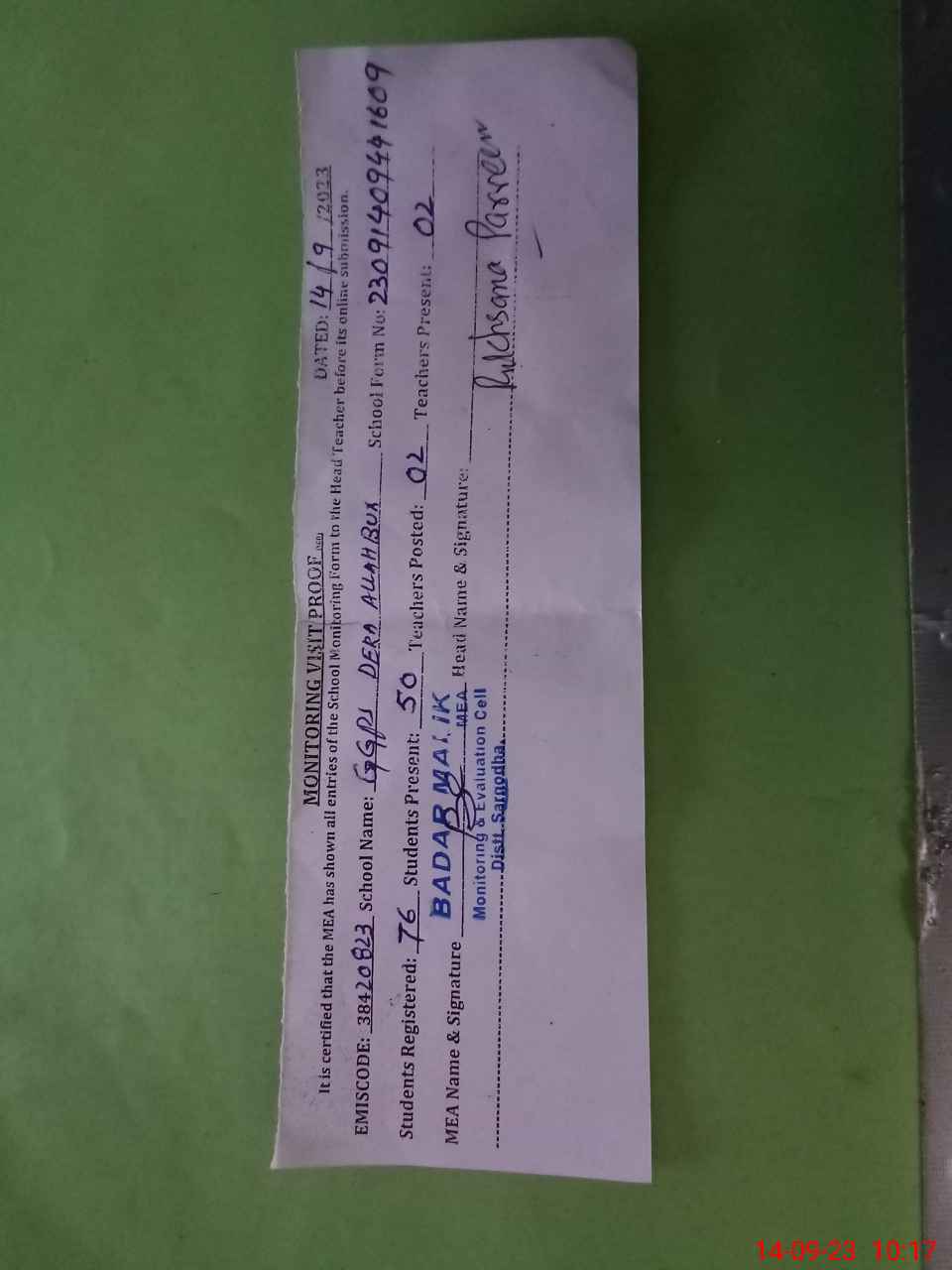 | Certified that this School was Inspected by the Undersigned MEA/DMO Today and the Information Stated Above is as Per Record. | |||||
