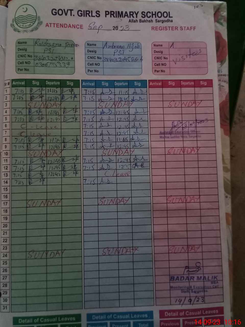 | CNIC | Full Name | Designation | R/C | Absence During Last Calender Month |