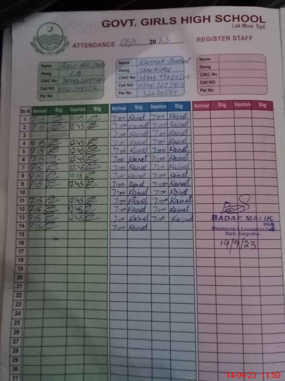 | CNIC | Full Name | Designation | R/C | Absence During Last Calender Month |
