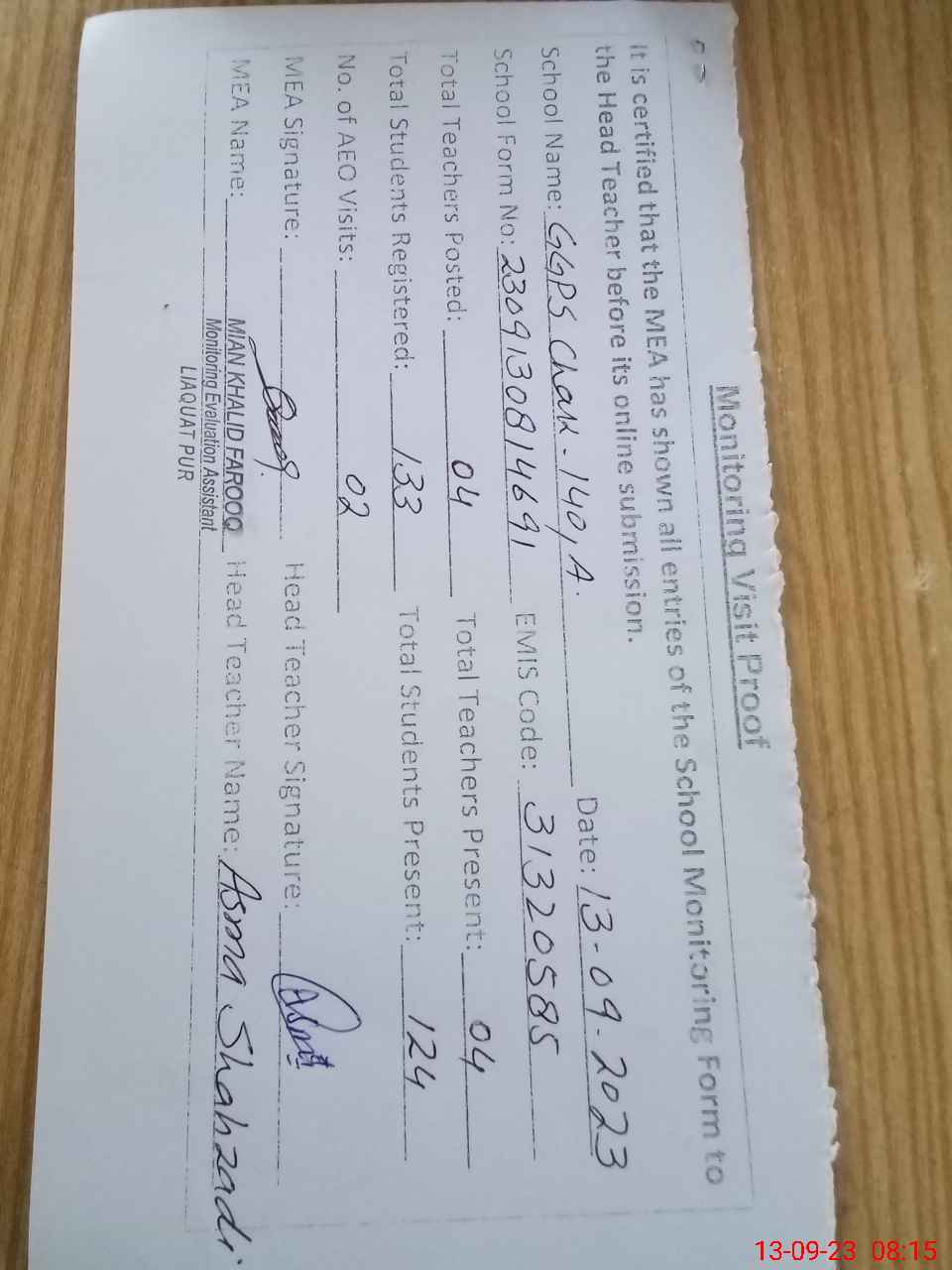 | Attendance Register | Head Teacher | MEA with School | Visit Proof |