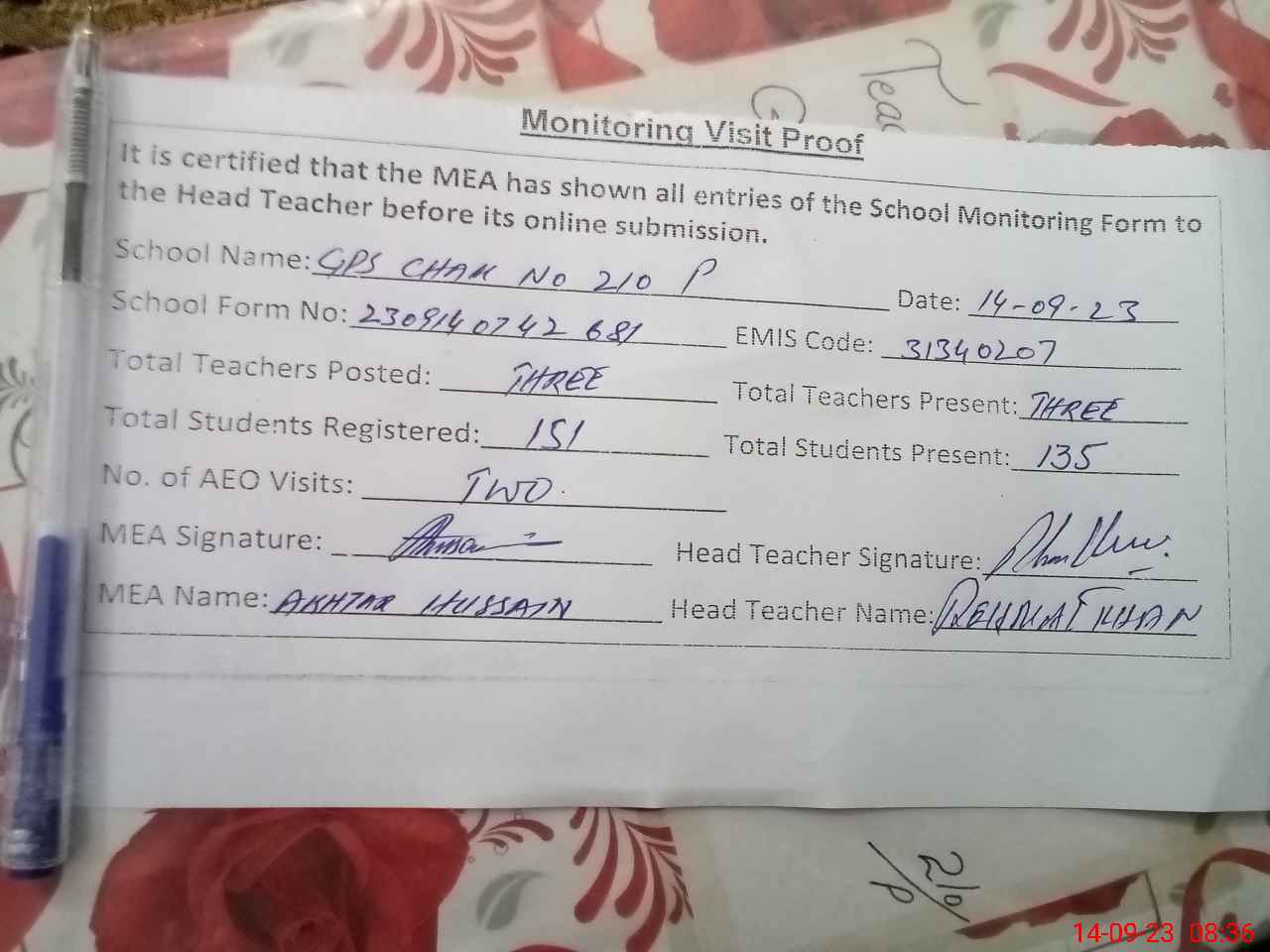 | Attendance Register | Head Teacher | MEA with School | Visit Proof |