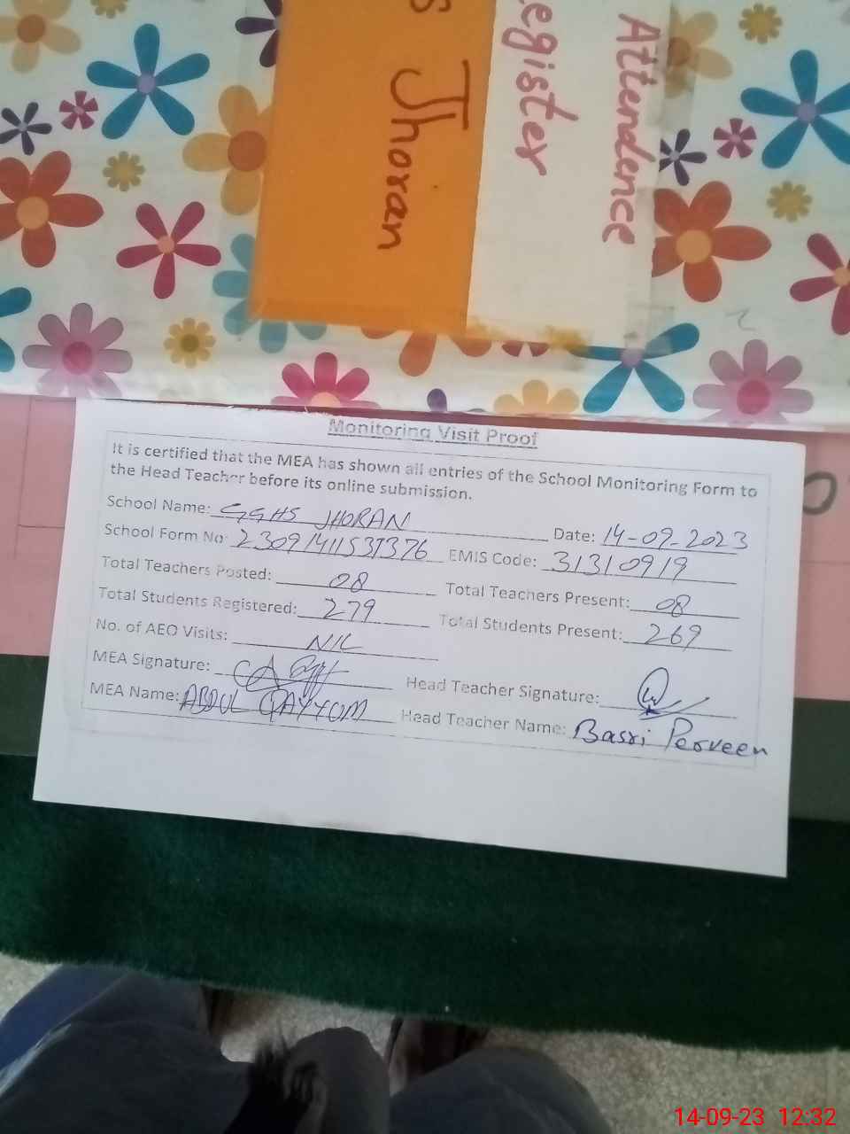 | EMIS Code: 31310919 | Name of School: GGHS JHORAN | |||