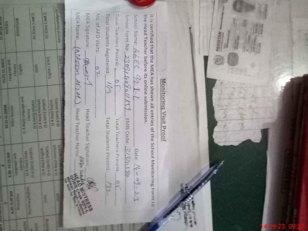 | Attendance Register | Head Teacher | MEA with School | Visit Proof |
