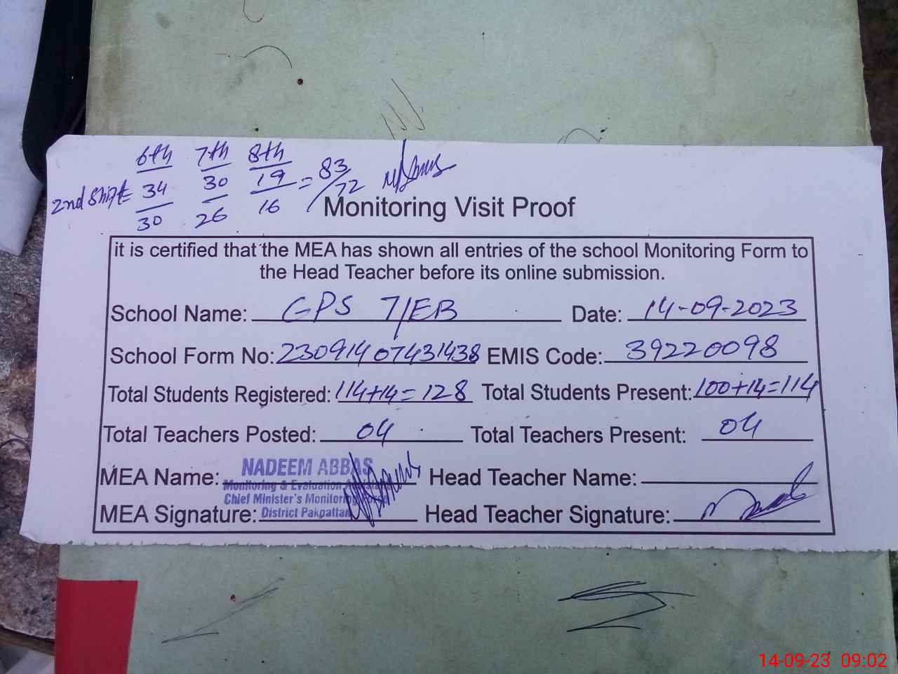 | Attendance Register | Head Teacher | MEA with School | Visit Proof |