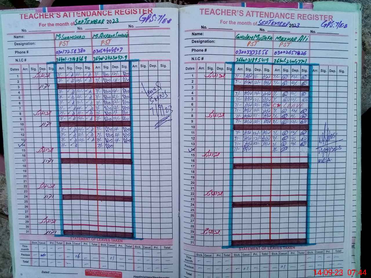 | Name: MU**** SH**** Designation: (School Headmaster's/Headmistress's) PST Phone/Cell Number: 03**** |