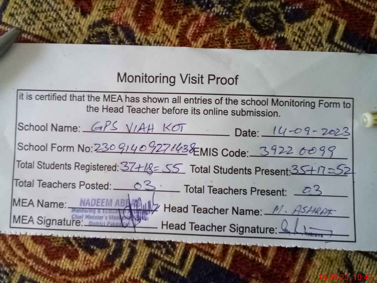 | EMIS Code: 39220099 | Name of School: GPS VIAH KOT | |||