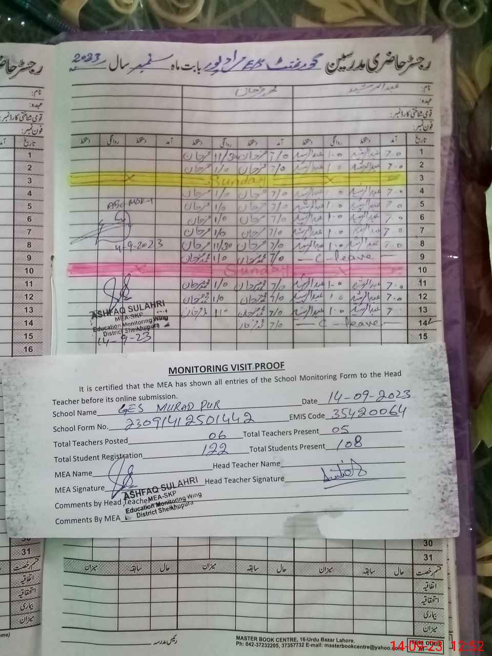 | Attendance Register | Head Teacher | MEA with School | Visit Proof |