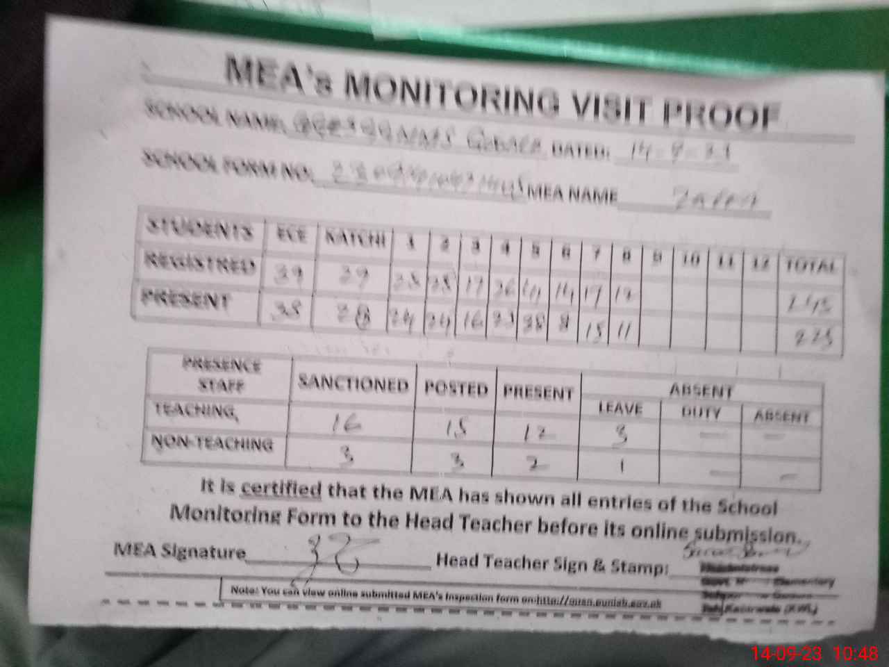 | Certified that this School was Inspected by the Undersigned MEA/DMO Today and the Information Stated Above is as Per Record. | |||||