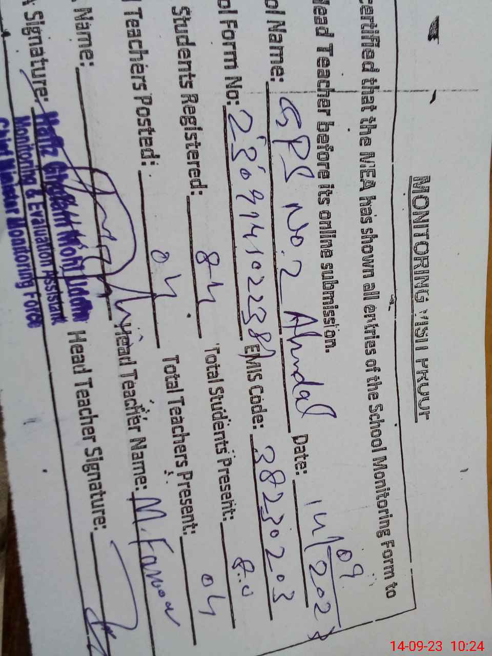 | EMIS Code: 38230203 | Name of School: GPS NO. 2 AHMEDAL | |||