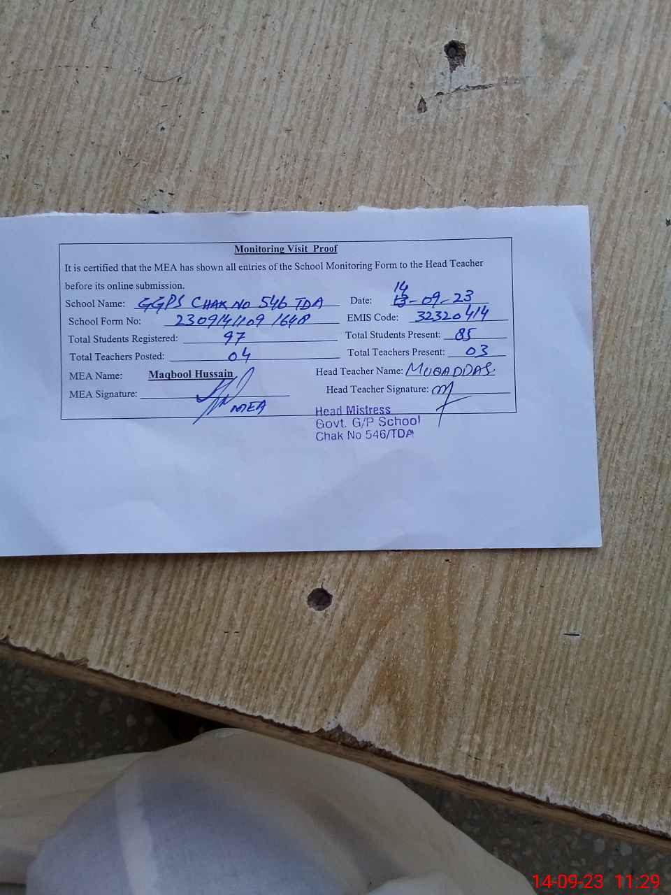| Attendance Register | Head Teacher | MEA with School | Visit Proof |