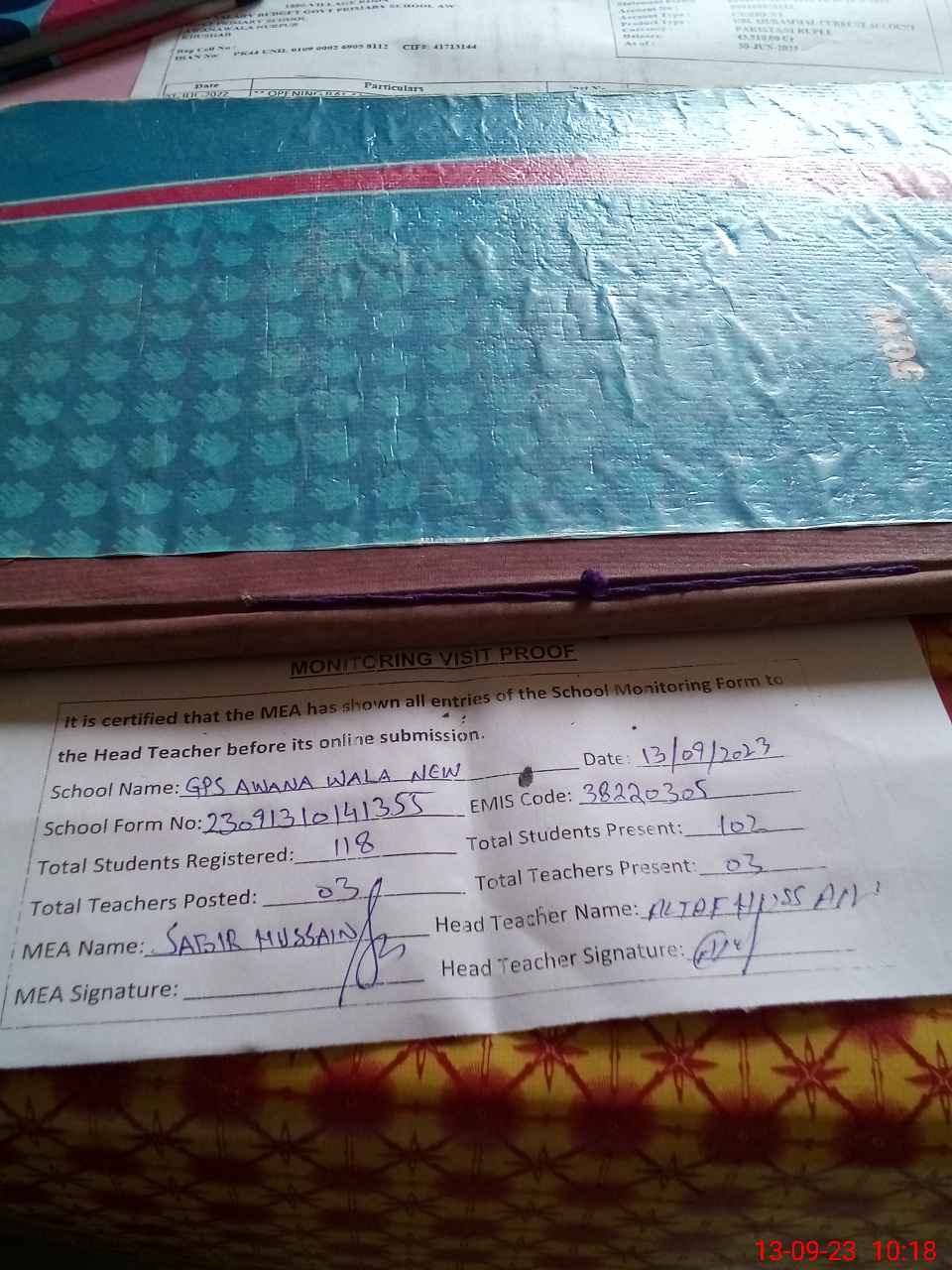 | Attendance Register | Head Teacher | MEA with School | Visit Proof |