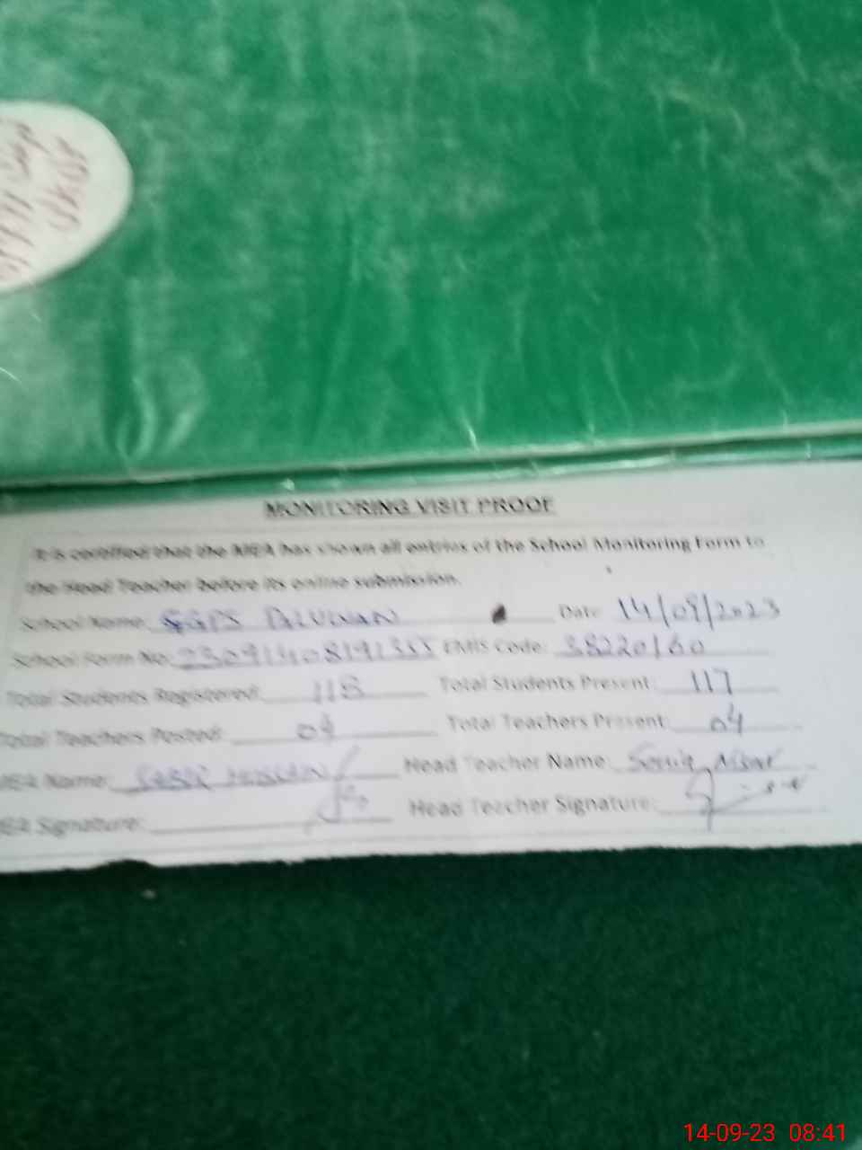 | Attendance Register | Head Teacher | MEA with School | Visit Proof |