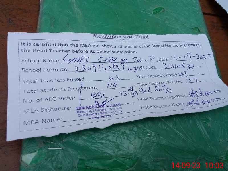 | EMIS Code: 31310537 | Name of School: GMPS CHAK NO 30/P | |||