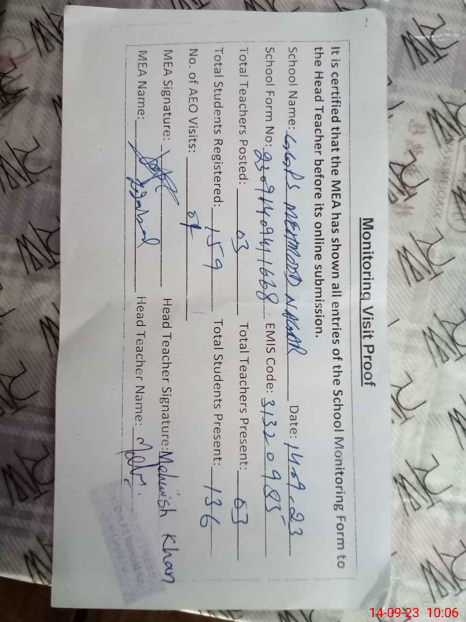 | EMIS Code: 31320985 | Name of School: GGPS MAHMOOD NAGAR | |||