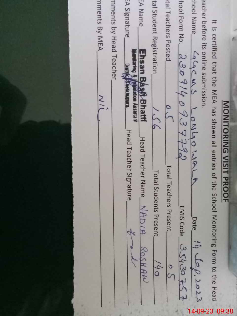 | Attendance Register | Head Teacher | MEA with School | Visit Proof |