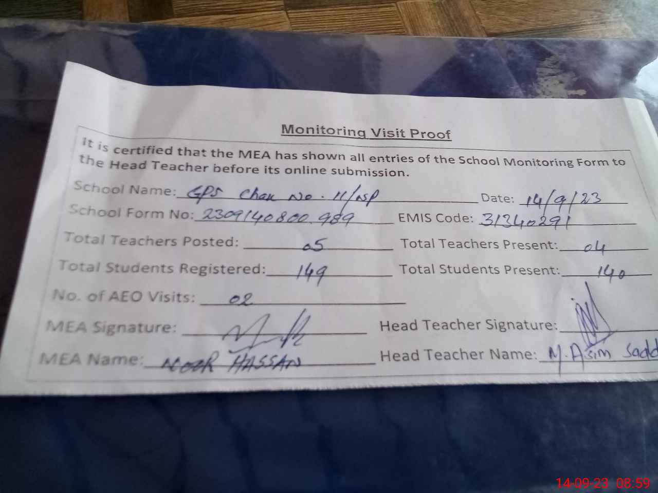 | Attendance Register | Head Teacher | MEA with School | Visit Proof |