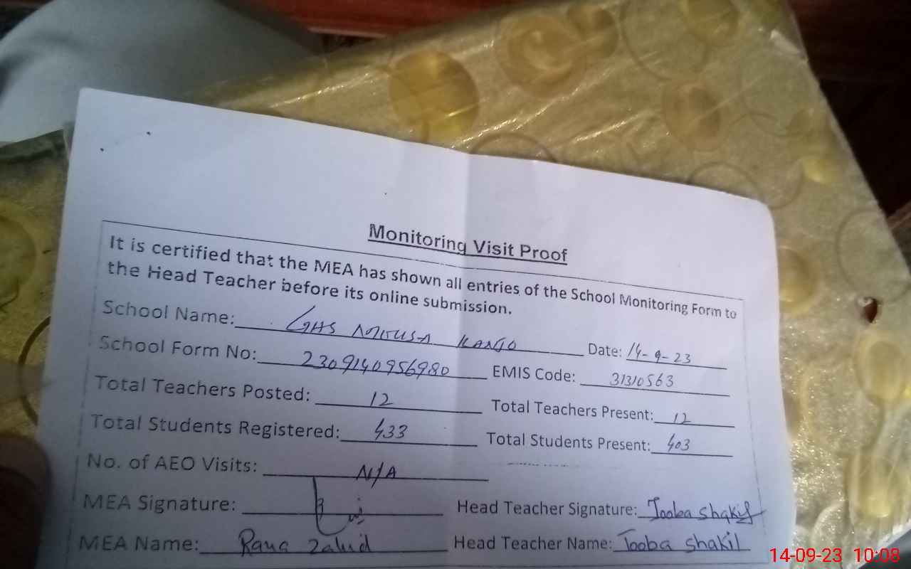 | Certified that this School was Inspected by the Undersigned MEA/DMO Today and the Information Stated Above is as Per Record. | |||||